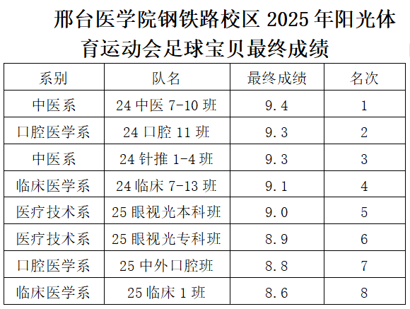 此次足球宝贝比赛的成功举办,是我校阳光体育运动会的重要组成部分,不仅丰富了校园文化生活,更激发了同学们参与体育活动的热情,展现了新时代医学生青春靓丽、奋勇拼搏的良好形象。