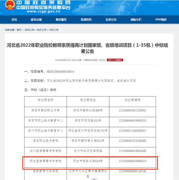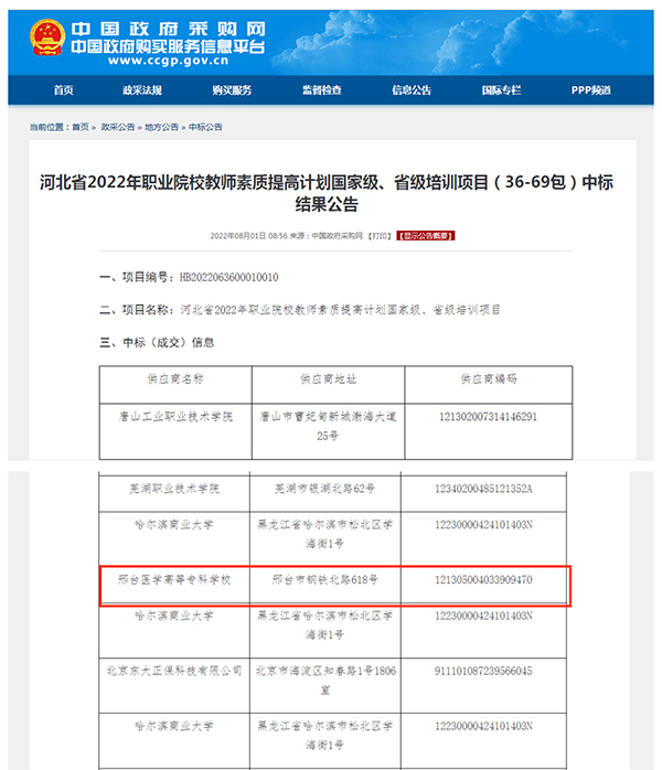 近日,中国政府采购网公布了河北省2022年职业院校教师素质提高计划国家级、省级培训项目中标结果,我校申报的大学生心理健康指导教师培训、职业学校学生心理疏导与心理危机干预专题培训、技能大赛指导教师课赛融合与技能训练培训(医药卫生大类)、产业导师特聘和教师企业实践5个项目成功获批,计划培训245人,累计项目资金99.8万元,项目数和项目资金均创历史新高。