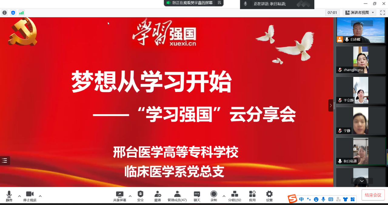 为进一步做好“学习强国”学习平台推广使用工作,调动广大师生学好用好平台的积极性,近日,学校组织各党总支采取线上视频会议的形式,广泛开展了以“梦想从学习开始”为主题的学习经验“云分享”活动,3600余名师生参加。