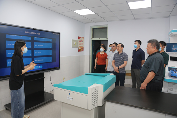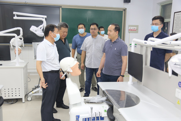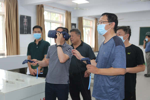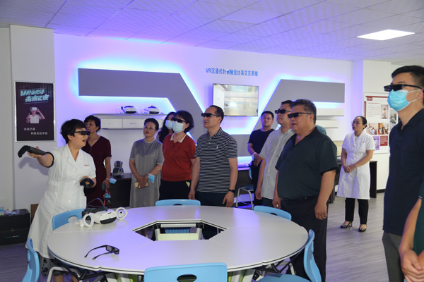 调研组分别到基础部、口腔系、中医系实地参观了各专业实训室,详细了解了专业设置、实践教学、人才培养等情况,并饶有兴致地佩戴专业设备体验了VR虚拟仿真教学和3D全息交互教学。