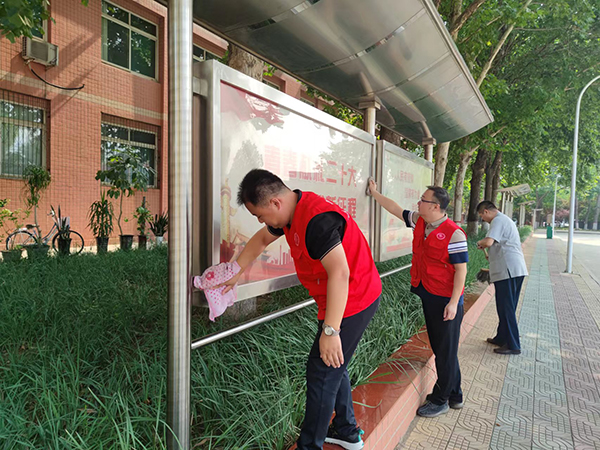 组织党员志愿服务活动。机关第一党支部组织16名党员在校园内办公楼周边捡拾垃圾,擦拭宣传栏、公开栏等,基础医学部党总支组织22名党员在金华岗开展文明交通劝导、到医专家属院开展联创共建进社区等志愿服务活动,活动中党员们不怕热、不怕累,在具体实践中展示党员的先进性。