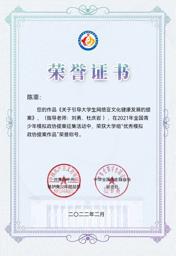 近日,2021年全国青少年模拟政协提案征集活动评选结果揭晓,我校口腔医学系陈菲同学提交的《关于引导大学生网络亚文化健康发展》的提案在全国1447件模拟提案作品中脱颖而出,获评大学组“优秀模拟政协提案作品”。