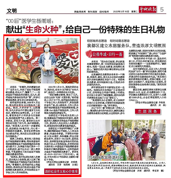 近日,《牛城晚报》、文明邢台微信公众号等媒体对我校学生杨雨瑶成为造血干细胞捐献志愿者的事迹进行报道。
