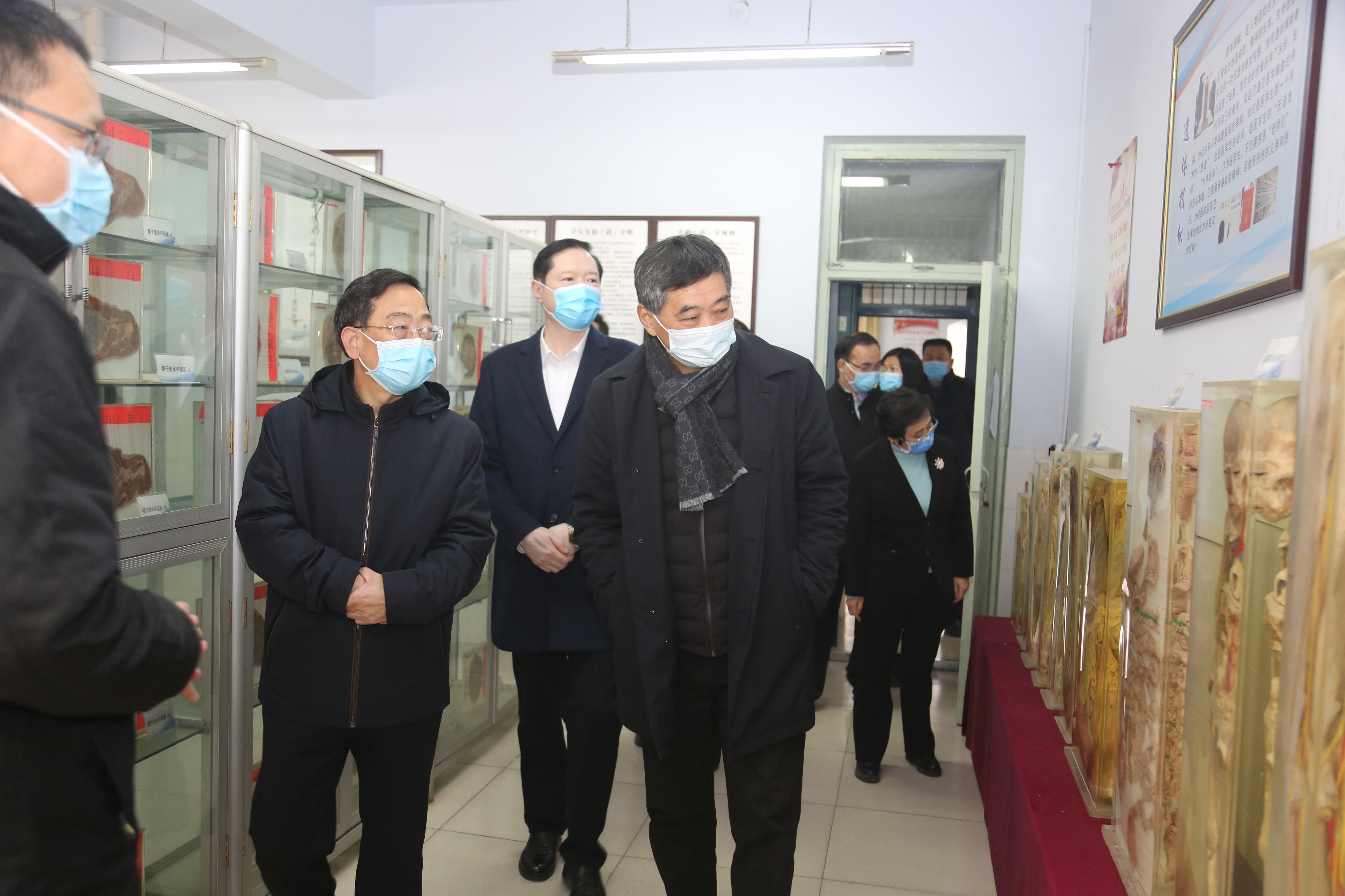 李兆申院士先后参观了基础医学部标本陈列室、数字解剖实验室,中医系中医药发展史展示厅、中药真伪鉴别室、中药标本展厅、方药调剂实训室,简要了解了学校办学规模、实验场所硬件基础设施建设、教学和科研工作开展情况。他对学校近年来的发展变化表示肯定,并勉励学校继续发挥特色优势,以社会需求为导向培养高素质人才。