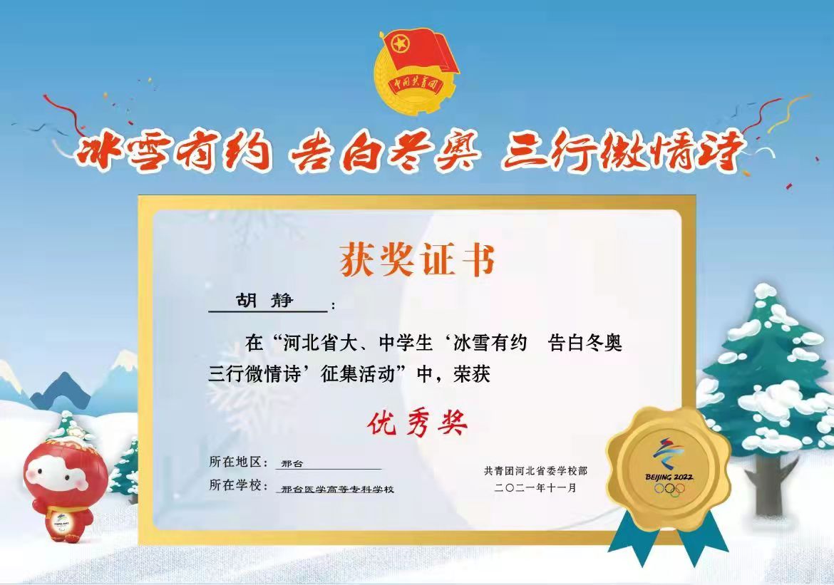 近日,由团省委学少部举办的“冰雪有约 告白冬奥——三行微情诗”作品征集大赛落下帷幕,药学系2021级普药1班胡静荣获大赛优秀奖。