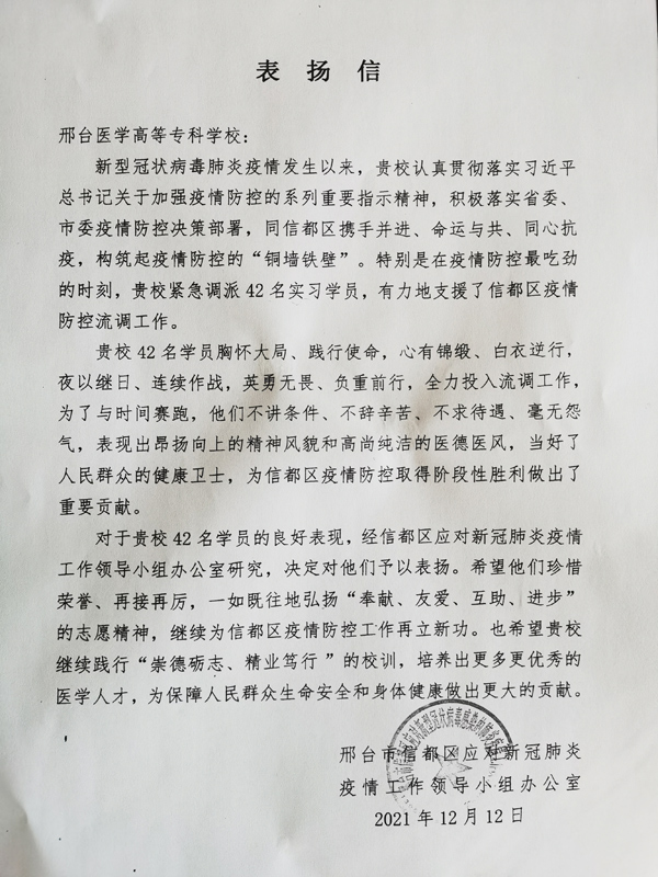 近日,我校收到来自邢台市信都区应对新冠肺炎疫情工作领导小组办公室发来的表扬信。信中表扬我校认真贯彻落实习近平总书记关于加强疫情防控的系列重要指示精神,积极落实省委、市委疫情防控决策部署,同信都区携手并进、命运与共、同心抗疫,构筑起疫情防控的“铜墙铁壁”。特别是在疫情防控最吃劲的时刻,紧急调派42名实习学员,有力地支援了信都区疫情防控流调工作。