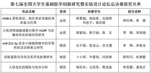 12月3日至5日,第七届全国大学生基础医学创新论坛暨实验设计大赛总决赛在陕西西安顺利闭幕,我校5个团队荣获金奖2个、银奖2个、铜奖1个,金奖及获奖总数均居全国第一,学校荣获优秀组织奖。