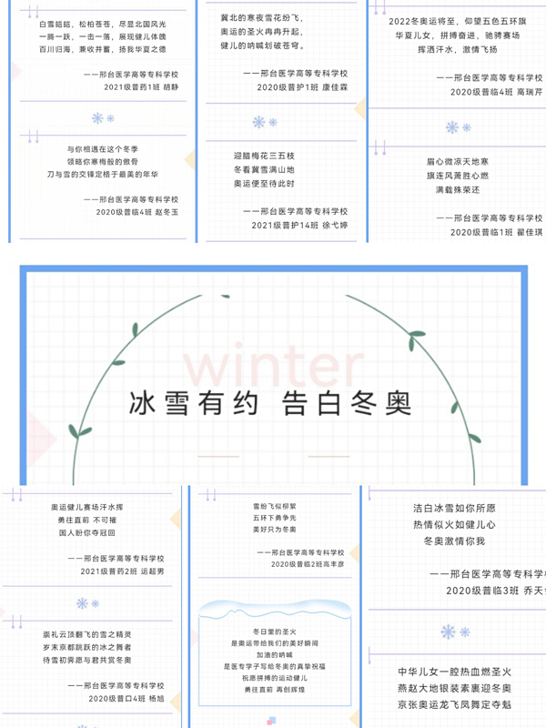 为迎接北京2022年冬奥会和冬残奥会,弘扬奥林匹克精神,引领全校学生了解奥运、宣传奥运,参与冰雪运动, 12月8日,团委“冰雪有约,告白冬奥——三行微情诗”征集活动圆满结束。