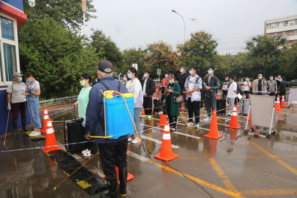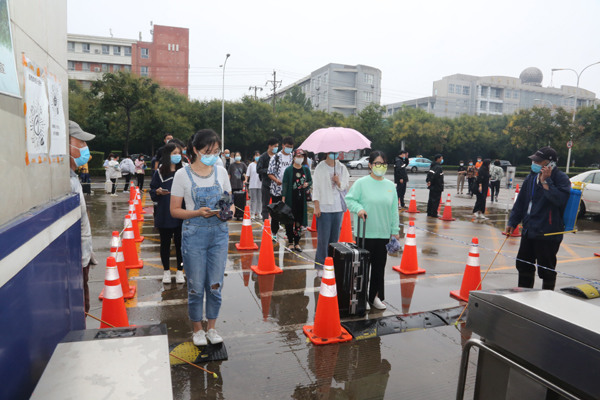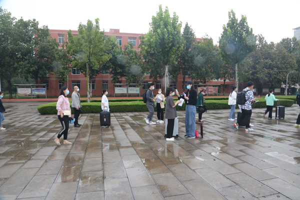 在图书馆前广场,各系分组查验健康码、行程码、14天居家体温监测表、两次核酸检测报告等,并为学生发放公寓出入卡。