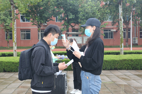在校门口,师生按一米线间隔有序排队,分两组测量体温、查看学生证件,工作人员对学生行李进行消毒,遇有体温异常者,立即送至观察点,由专业医务人员对其进行隔离观察。