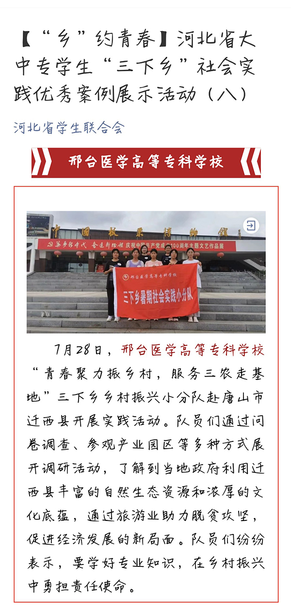 各实践小分队围绕党史百年、疫情防控、国情观察、乡村振兴等内容,广泛开展小规模、互动式、有特色、接地气的社会实践活动。张家口市实践小分队来到怀来县梁庄村、官厅镇等地,通过参观红色纪念馆,不断汲取红色力量。保定市实践小分队参观了冉庄地道战纪念馆,聆听了以张森林同志为代表的先烈事迹,并在纪念馆前宣誓:“愿以吾辈之青春,捍卫盛世之中华”。廊坊市实践小分队入村入户规范指导“七步洗手法”,并录制成视频分享给村民。唐山市实践小分队来到丰润区罗文口村,通过实地考察、咨询访谈等方式开展了“搞好文化产业,带动地区发展”乡村调研活动。其他地区的实践小分队也都按照计划有序开展了一系列富有成效、各具特色的社会实践活动。其中,校团委“青春聚力振乡村,服务三农走基地”三下乡乡村振兴社会实践小分队赴唐山市迁西县开展的实地调研活动在【“乡”约青春】河北省大中专学生“三下乡”社会实践优秀案例平台获展。