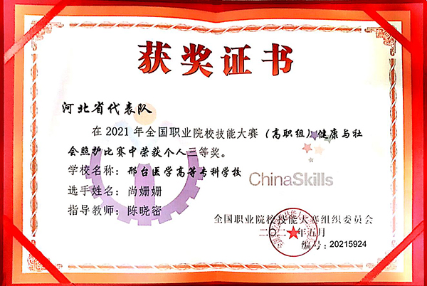 6月17日至20日,2021年全国职业院校技能大赛(高职组) “健康与社会照护”赛项在上海举办,来自全国的28个省(市)、自治区代表队同台竞技。我校选手尚姗姗代表河北省参赛,荣获全国大赛第十名、三等奖第一名!