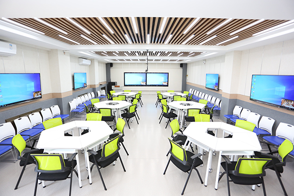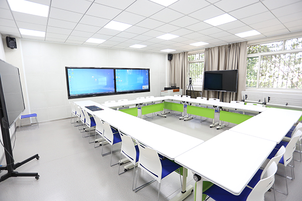 两间智慧教室分别为小组协作型智慧教室和研讨型智慧教室。利用软硬件、网络、APP及课程平台的一体化整合,实现师生互动、双屏双线教学、常态化录播、视频直播等功能,展现多样化、媒体化的教学环境。