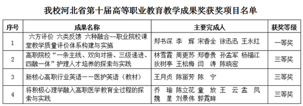 郑书深团队申报的《六方评价 六类反馈 六种融合--职业院校课堂教学质量评价体系构建与实施》荣获一等奖;林雪霞团队申报的《高职院校“一条主线、双向对接、三级递进、四融一体”护理人才培养的探索与实践》、王月贞团队申报的《新核心高职行业英语——医护英语(教材)》、乔瑜团队申报的《将积极心理学融入高职医学教育全过程的探索与实践》荣获三等奖。