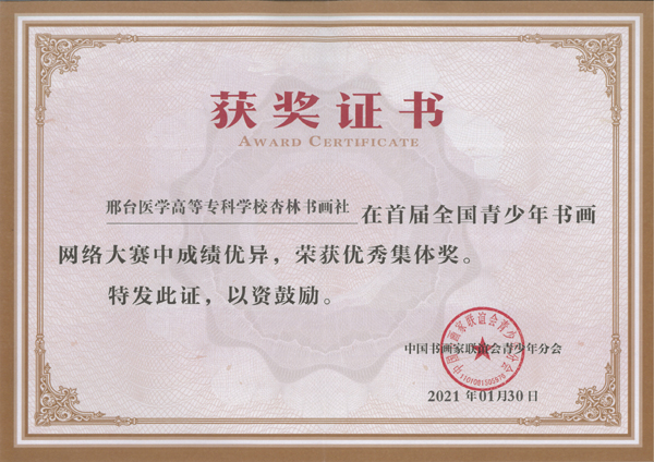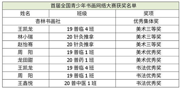 该项赛事由中国书画家联谊会青少年分会主办,是提升个人文化修养、审美情趣和增进交流、提高技能的平台。我校杏林书画社学生踊跃报名,在社团指导老师王烈的帮助下就作品内容和形式进行反复修改,最终取得了可喜成绩。