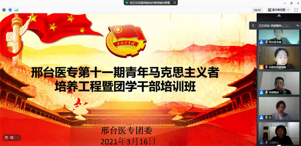 为了深入学习贯彻习近平新时代中国特色社会主义思想和党的十九大精神,提高我校学生骨干、团干部、青年知识分子等青年群体的思想政治素质、政策理论水平、创新能力和实践能力,校团委举办了线上邢台医专第十一期青年马克思主义者培训工程暨团学干部培训班。3月16日举行了开班仪式,共计300余人参加。