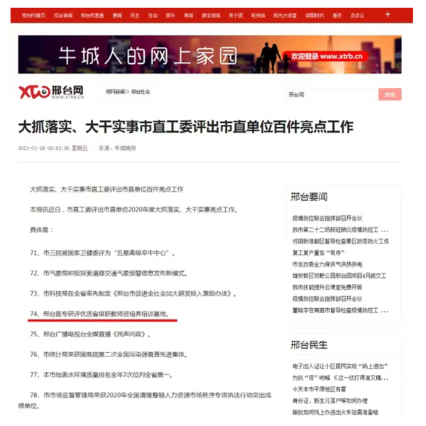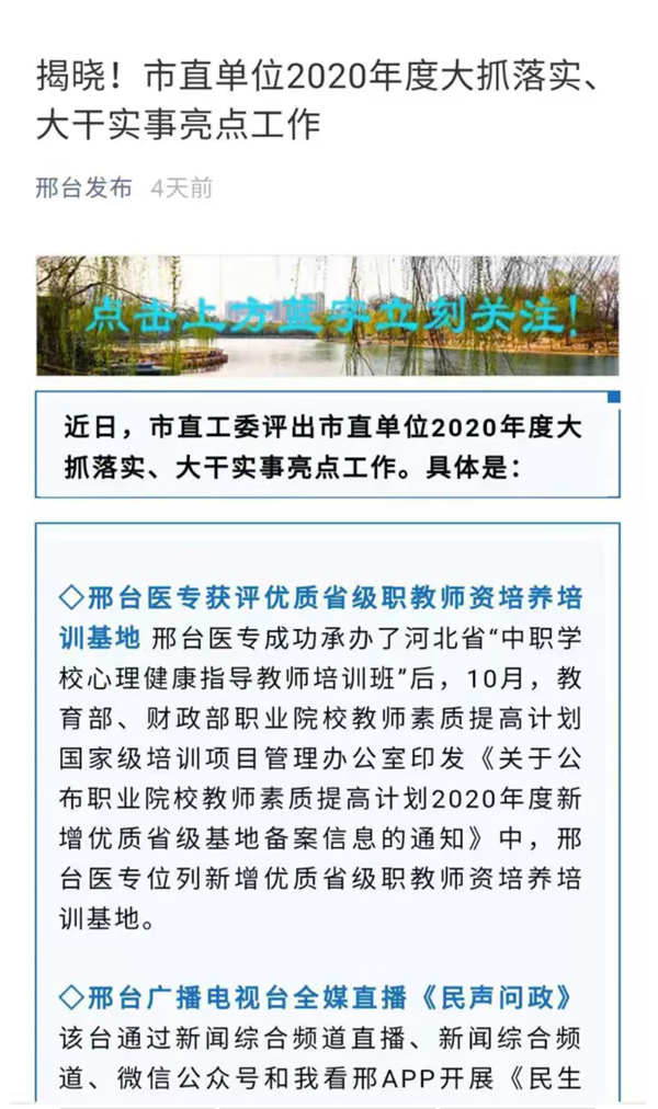 近日,市直工委揭晓《市直单位2020年度大抓落实、大干实事亮点工作》,由组宣处结合学校发展的大事要事,积极筛选、挖掘、提炼、报送的“邢台医专获评优质省级职教师资培养培训基地”被评为亮点工作。