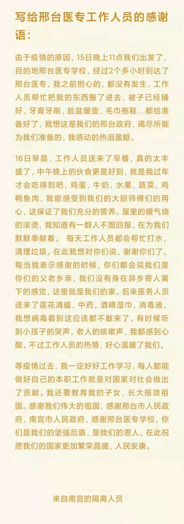 1月20日,我校收到一位南宫隔离人员的感谢信。