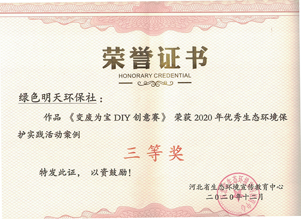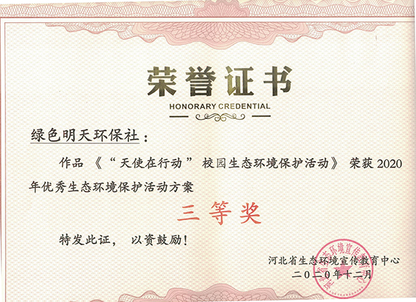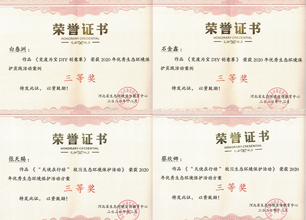 近日,由河北省生态环境宣传教育中心组织的“2020年河北省大学生环保社团优秀生态环境保护系列活动征集评选”活动落下帷幕,我校绿色明天环保社《变废为宝DIY创意大赛》作品荣获“2020年优秀生态环境保护实践活动案例”三等奖、《“天使在行动”校园生态环境保护活动》作品荣获“2020年优秀生态环境保护活动方案”三等奖,张天赐、蔡新娜、石金鑫、白春洲4名同学荣获个人三等奖。