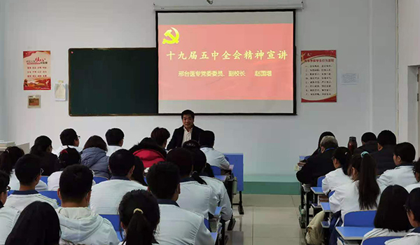赵国增副校长围绕《中共中央关于制定国民经济和社会发展第十四个五年规划和二〇三五年远景目标的建议》,在回顾“十三五”时期经济社会发展取得的一系列成就的同时,结合鲜明生动的案例对“十四五”规划及二〇三五年远景目标进行了全面深刻的讲解,帮助师生深入领会和把握党的十九届五中全会精神的核心要义。赵国增副校长还结合河北省委书记王东峰在庆祝河北省政协成立70周年座谈会上的讲话和邢台市委书记钱三雄到我校宣讲党的十九届五中全会精神宣讲报告,从我校学生观念树立、道德养成、职业发展等多角度对学生提出了具体要求。他号召广大学生要增强自律、热爱劳动、提倡环保、从我做起,养成良好的生活习惯;珍惜时间、刻苦学习、造就本领、医者仁心、救死扶伤,为报效国家、实现梦想打下坚实的基础,做德智体美劳全面发展的社会主义建设者和接班人。