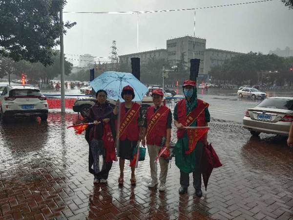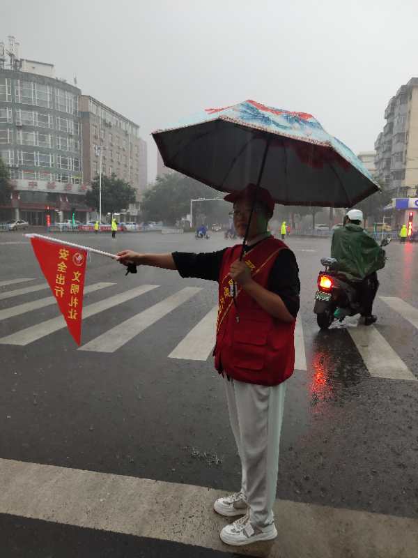 参加此次志愿协勤服务的4人中有3人年龄在55岁以上.尽管年龄较大,天气恶劣,但大家仍然在暴雨中高质量完成任务,他们的行为受到了出行市民及执勤交警的一致好评,这种坚守精神和敬业精神充分展现了我校教师良好的文明素质和形象,也为我市创建文明城市增添了一抹亮丽的风景。