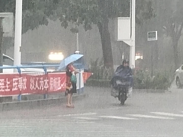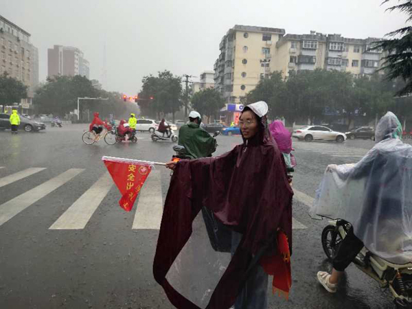 8月12日早上7:30到8:30,暴雨如注,中医系党总支梁丽英、韩会卿、魏艿、姚颖4名文明交通劝导服务志愿者坚守在斑马线前,助力创建全国文明城市。