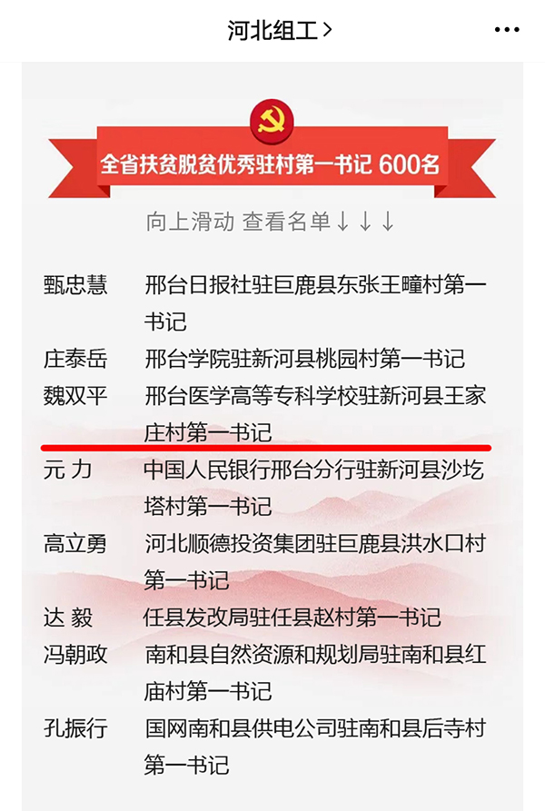 近日,河北省召开纪念中国共产党成立99周年座谈会。会上通报表扬了600个“全省扶贫脱贫先进驻村工作队”、600名“全省扶贫脱贫优秀驻村第一书记”、1000名“全省扶贫脱贫优秀驻村工作队员”,充分肯定了广大驻村干部在打赢脱贫攻坚战中发挥的积极作用。其中,我校驻新河县南王家庄村第一书记魏双平荣获“全省扶贫脱贫优秀驻村第一书记”称号。