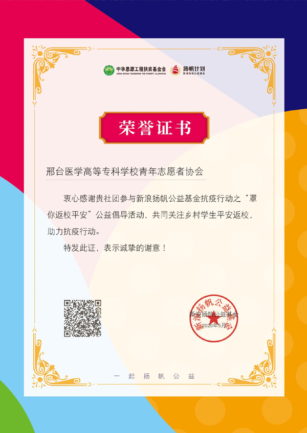 近日,我校青年志愿者协会收到一封来自新浪扬帆公益基金感谢信及助力抗疫行动表现优秀荣誉证书。信中这样写到:“亲爱的邢台医学高等专科学校青年志愿者协会,衷心感谢贵社团参与新浪扬帆公益基金抗疫行动之“罩你返校平安”公益倡导活动,共同关注乡村学生平安返校,助力抗疫行动,感谢所有参与此次新浪扬帆公益基金抗疫行动之“罩你返校平安”公益倡导活动的小伙伴们,谢谢小阔爱们为活动忙前忙后,特发此证,表示诚挚谢意”。