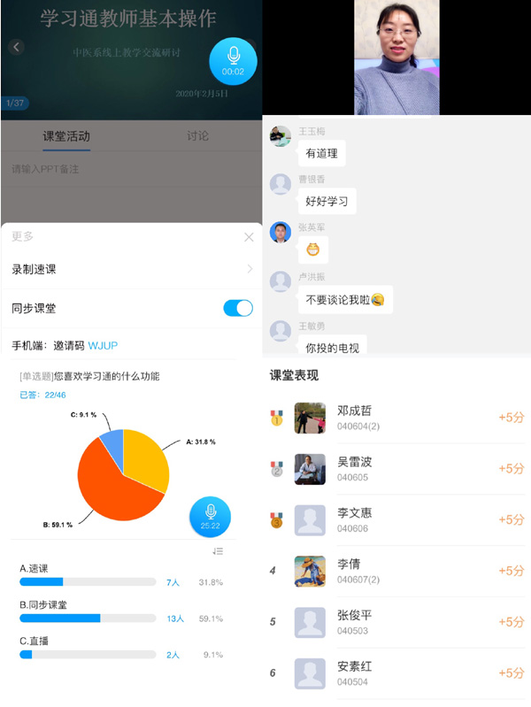 为落实上级及学校“停课不停教、不停学”的指示精神,2月5日下午,中医系利用超星学习通平台组织全系教工在家里以手机线上同步体验的形式开展了一次“线上教学培训体验课”。