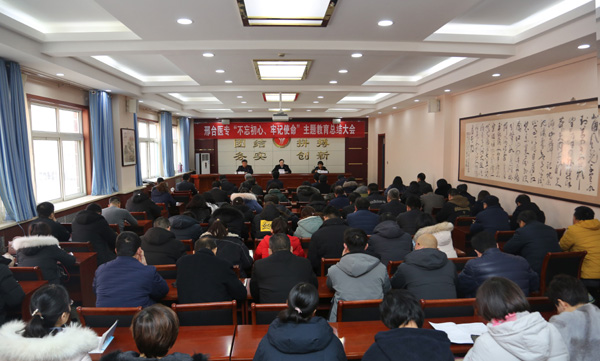 1月13日下午,我校在图书馆北一楼会议室召开“不忘初心、牢记使命”主题教育总结大会,学校党委书记、主题教育领导小组组长田德荣作“不忘初心、牢记使命”主题教育开展情况总结。市委第二巡回指导组组长石富荣,成员武晓辉、杜东跃出席会议。学校领导班子成员以及中层干部,各党总支委员,党支部书记、副书记,正高级职称党员教师代表120余人参加会议。会议由学校党委副书记、校长郑书深主持。