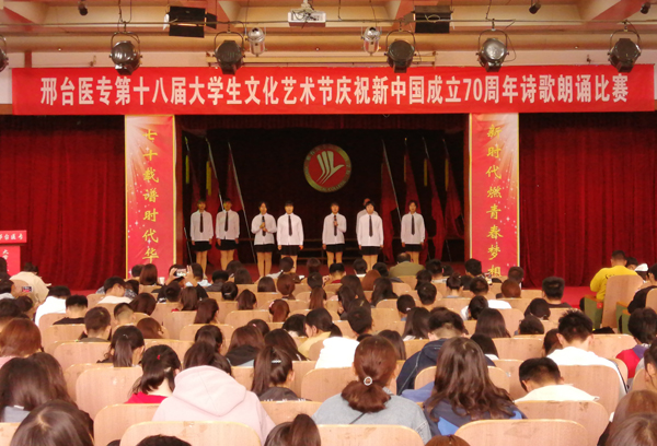 10月22日,第十八届大学生文化艺术节庆祝新中国成立70周年诗歌朗诵比赛在报告厅举行。此次活动由校团委主办,中医系承办。校团委书记杜庆岩同志和各系团总支书记出席活动并担任评委。团委、大学生社团联合会学生干部以及各系学生代表200余人参加活动。