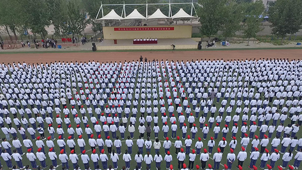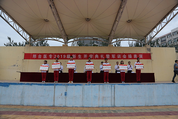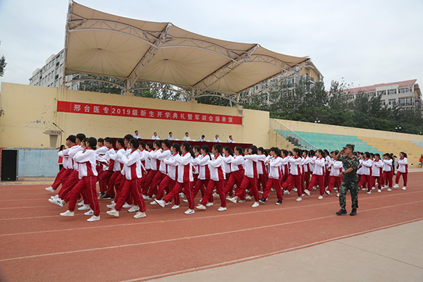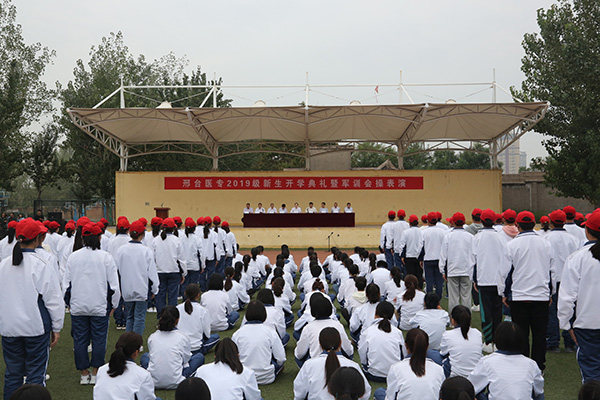 学校党委副书记、校长郑书深在典礼上致词。他代表全校师生员工向2019级新同学表示热烈欢迎和良好祝愿,对各位教官的辛勤付出表示衷心感谢,就学校的办学历史、办学格局、办学成果以及专业设置、师资力量、人才培养等作了简要介绍。郑校长对新生提出三点希望:一是以医学之梦想鼓舞青春之志向。要学好医学基础知识,不断培养自己的爱心、责任感,多参加社会实践、社团活动、志愿服务,了解国情、尊重生命,树立起家国情怀和大爱之心,用职业道德精神诠释“健康所系、性命相托”。二是以知识之实践淬炼青春之本领。要担当爱佑生命、救死扶伤的使命,练就过硬本领,锤炼良好道德品质,为将来成为一名德才兼备的医疗卫生工作者打下坚实的基础。三是以青年之奋斗砥砺青春之品格。要学习做人、学习做事、学会学习、学习思考、学习尝试、学习认识自我、学习与人相处、学习选择、学习放弃、学习勤奋、学习保护自己、保护家人、学习做自己、学习坚持、学习包容、学习感恩、学习慎独,秉承“团结、拼搏、务实、创新”和“崇德、砺志、精业、笃行”的校风校训,砥砺奋进,学有所成,在邢台医专这个大家庭中放飞梦想,追逐梦想,实现梦想。