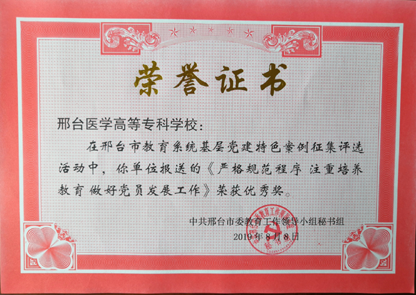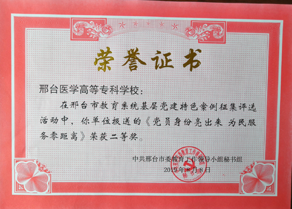 为贯彻落实党的十九大精神,深入推进教育领域党的建设,总结交流和宣传推广我市教育系统基层党组织建设的典型做法和先进经验,中共邢台市委教育工作领导小组秘书组在全市教育系统组织开展了基层党建特色案例征集评选活动。我校组织宣传处报送的基层党建特色案例《党员身份亮出来 为民服务零距离》荣获二等奖,《严格规范程序 注重培养教育 做好党员发展工作》荣获优秀奖。