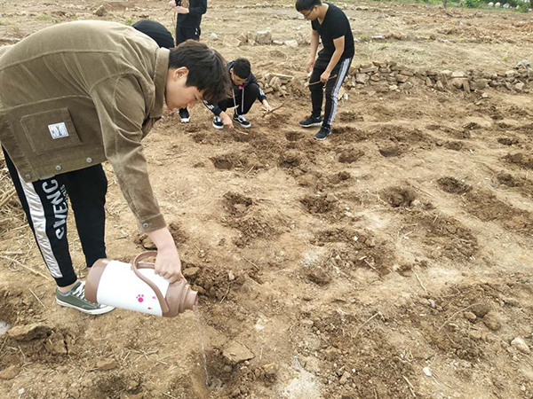 4月初,经过科学规划,周密布署,将教学楼周围的6亩土地划分成30块,分到各个班级,种植芍药和美人蕉,由各班级负责开垦荒地,植树种花。4月下旬,各班辅导员老师带领同学们扛上铁锹,背上花种,热火朝天的种植起来,经过多日劳动,将一块块荒地变成了花的沃土,充满勃勃生机。