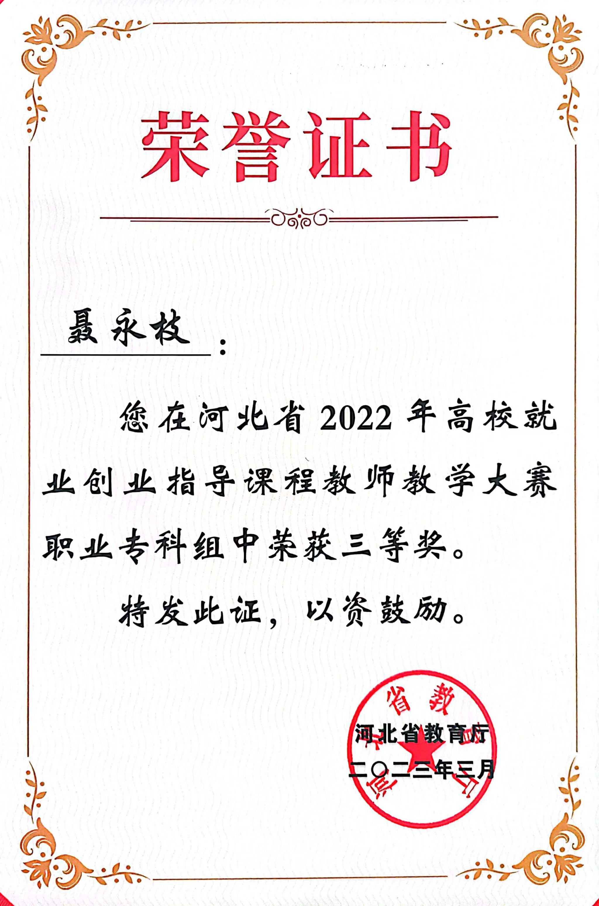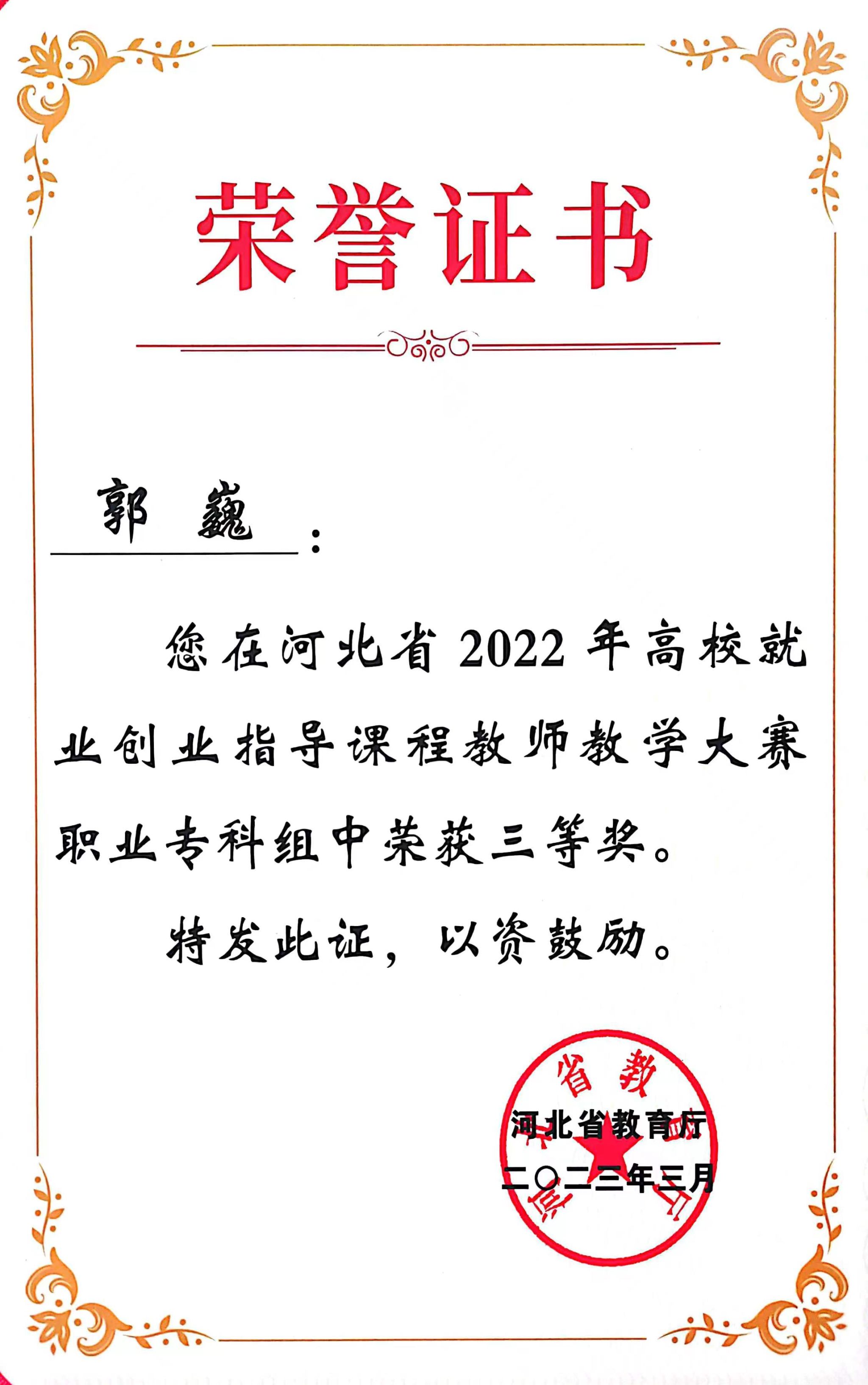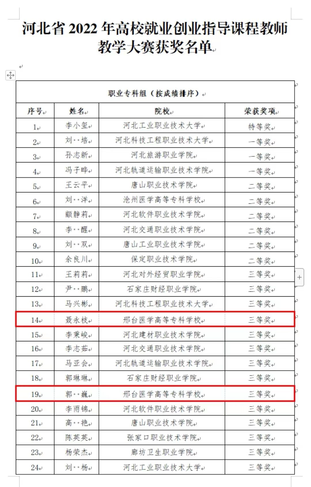 近日,河北省高校就业创业指导课程教师教学大赛落下帷幕,经过激烈比拼,我校郭巍、聂永枝两名教师从全省400余名参赛选手中脱颖而出,荣获职业专科组三等奖。