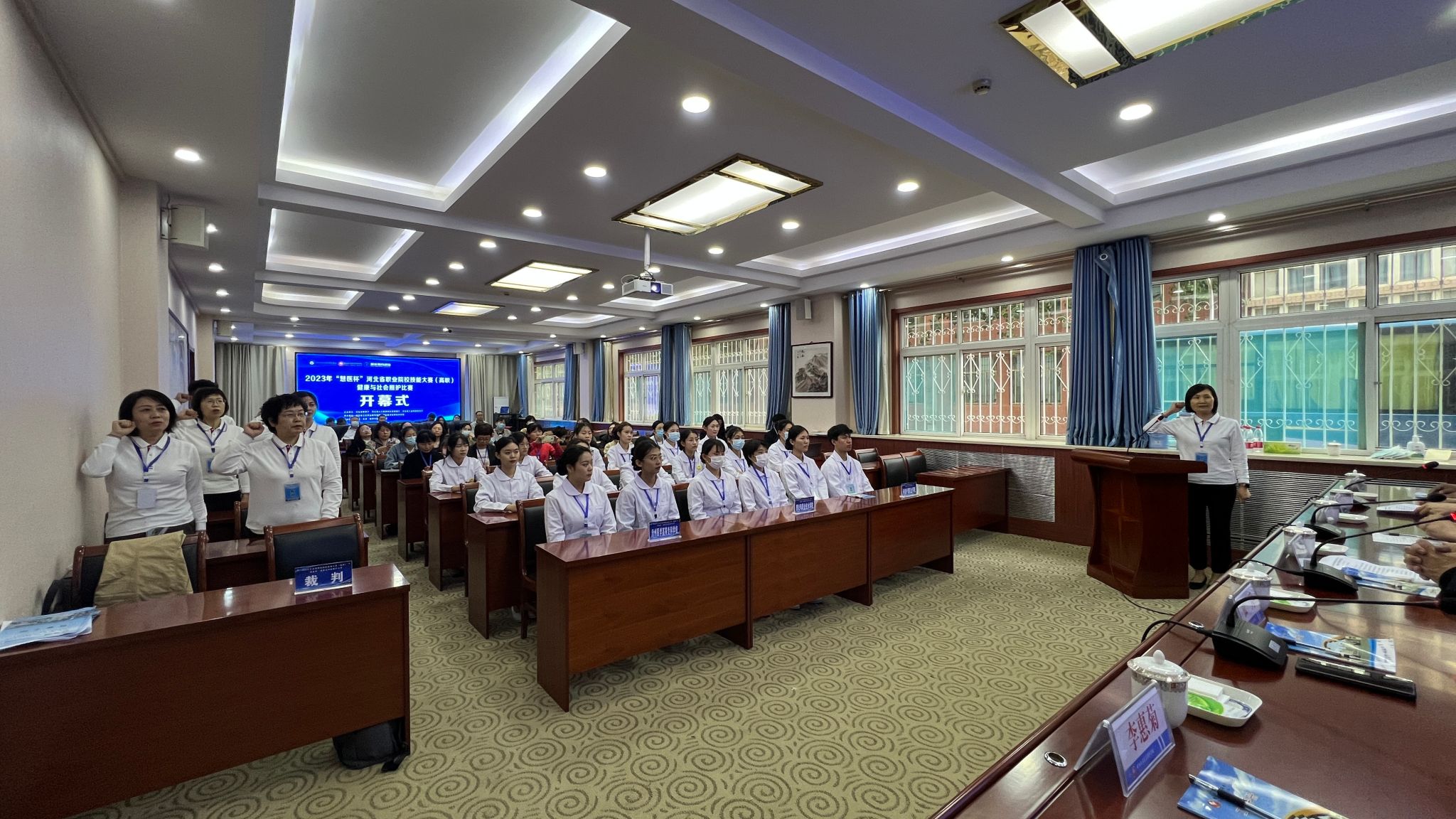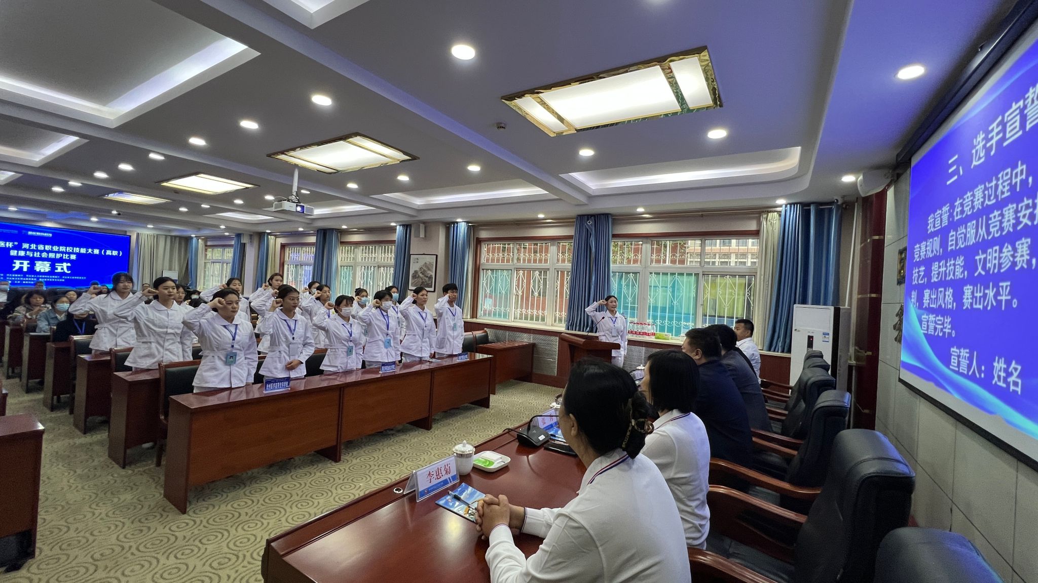 随后,裁判员和参赛选手分别进行了宣誓。河北卫生职业教育集团秘书长、沧州医专教务处处长王磊作了讲话,他希望各位专家裁判严格执法,加强指导,希望各选手通过比赛不断总结经验、超越自我,并预祝大赛取得圆满成功。
