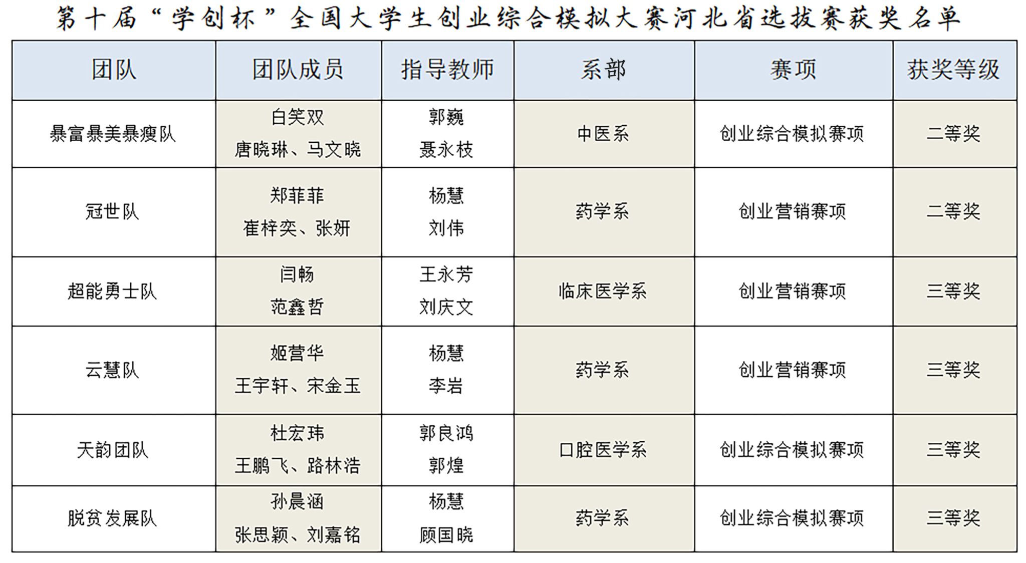 近日,第十届“学创杯”全国大学生创业综合模拟大赛河北省选拔赛在河北科技大学落下帷幕。我校6支参赛团队斩获二等奖2个、三等奖4个。