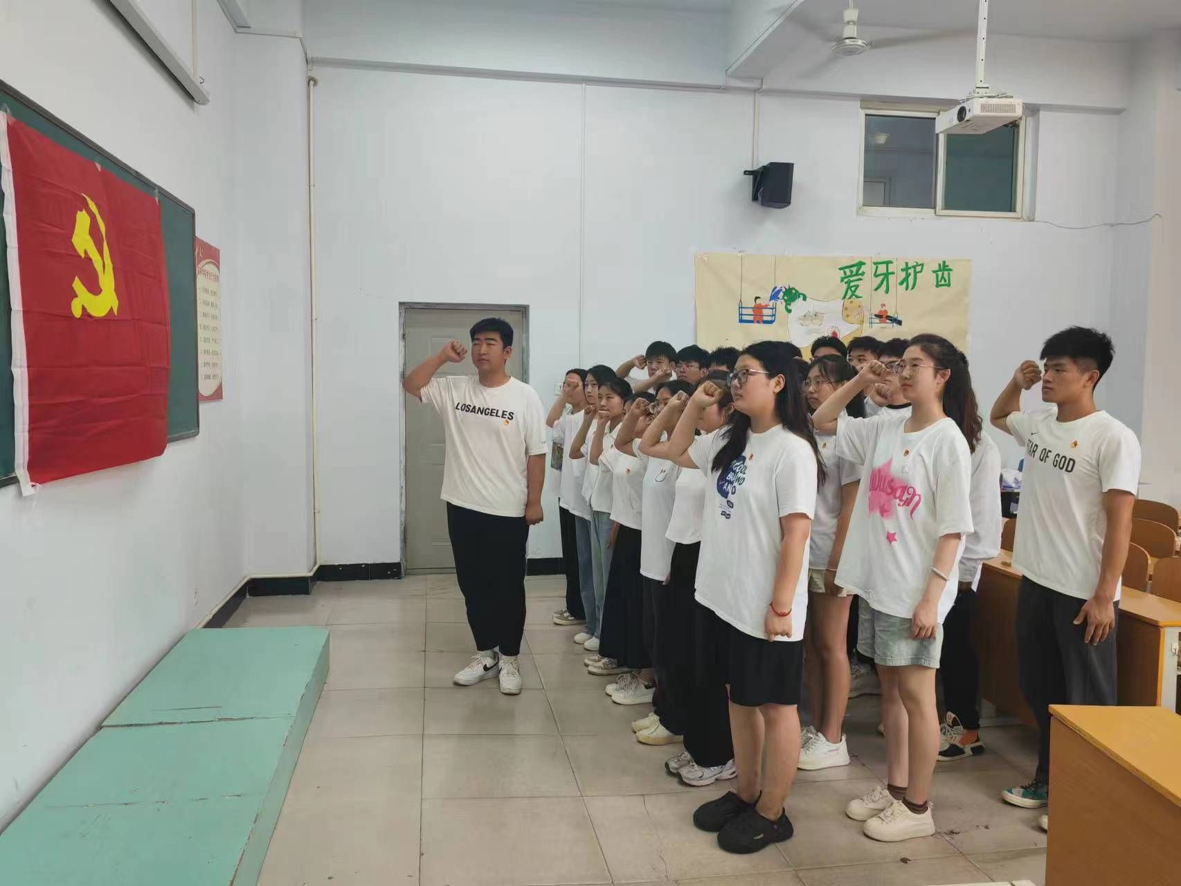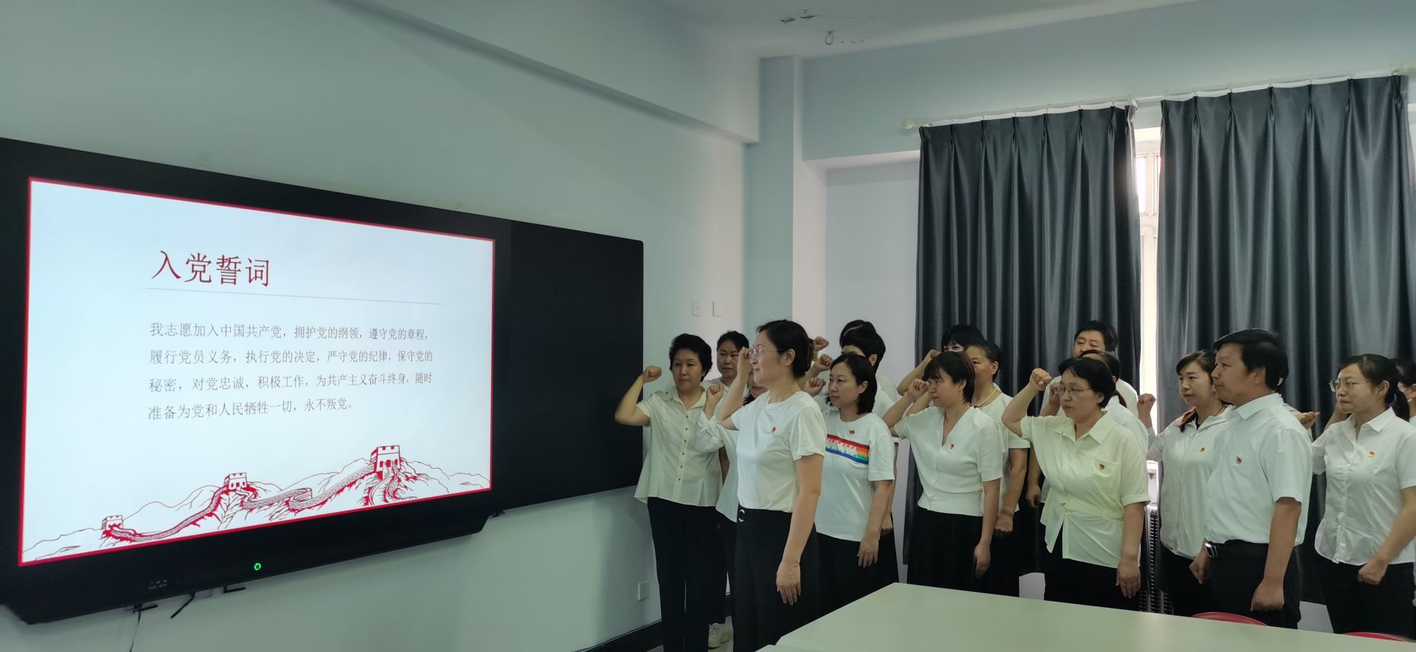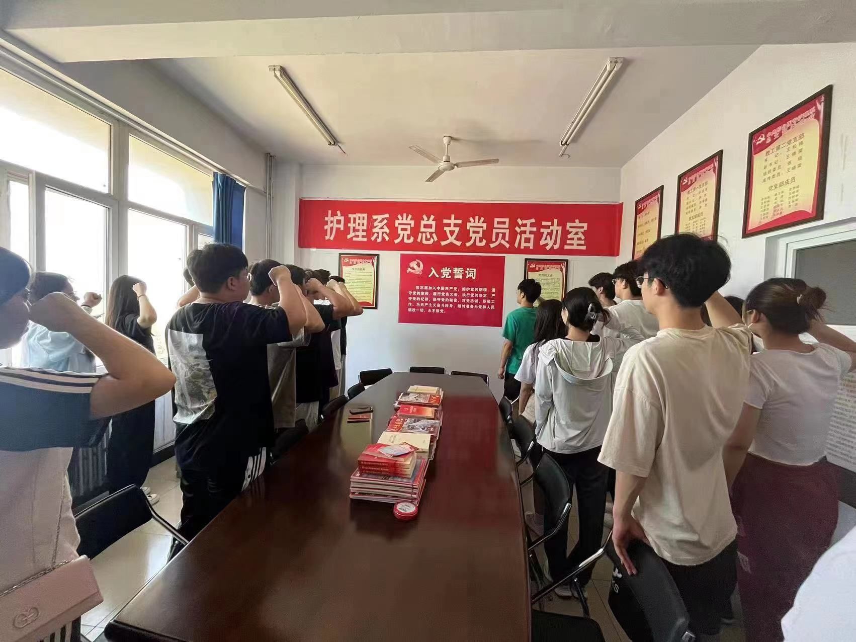 举行新党员入党宣誓仪式(老党员重温入党誓词)活动。各党支部组织新党员入党宣誓仪式(老党员重温入党誓词),党员们戴着党徽,面对鲜红的党旗和庄严的誓词,高举右拳,庄严宣誓:“我志愿加入中国共产党,………,随时准备为党和人民牺牲一切,永不叛党”。铿锵有力的誓言,表达了新党员听党话、跟党走的坚定决心,让老党员再次接受心灵的洗礼,体现了新老党员同志们对党的无比热爱和忠诚。护理系党总支新入党的学生党员鲁璇表示加入党组织完成青年追求政治进步的“人生三部曲”最关键的一步,入党不仅是一份荣耀,更是一种责任,要以今天为一个新的起点,以入党宣誓为新的动力,切实践行入党誓词。口腔医学系党总支专职组织员卢青感言:面向党旗,重温入党誓词,意义在于与时俱进,恪守承诺。无论是当年入党宣誓还是现在重温誓词,最重要都的是要牢记誓词,并以具体、实在、一以贯之的行动去恪守,在自己的岗位上,发挥党员的先锋模范作用。