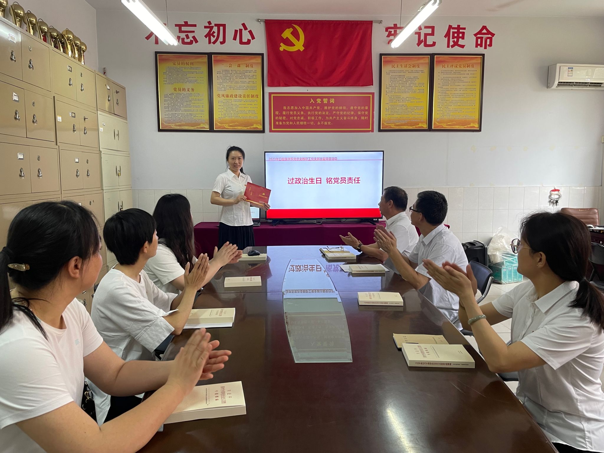 为党员过“政治生日”活动。各党支部开展为党员过“政治生日”活动,为82名党员送上一张“政治生日”贺卡,并致以诚挚问候和祝愿。基础医学部党总支党员李鑫表示,通过过“政治生日”,更深刻的理解入党誓词的内涵和意义,在今后的学习工作中,会把誓词的内容和当前的工作任务进一步结合,把入党时的追求和现在的思想实际相对照,从大处着眼,于细微处做起,发挥党员的先锋模范作用。临床医学系党总支张云鹏表示,“政治生日”的到来,提醒作为党员又增长了一岁,作为一名党员教师要不忘初心、牢记使命,信守誓言,践行承诺,入党越久,教龄越长,就更要保持党性,切实发挥党员的先锋模范作用,为教育事业做出自己的贡献。