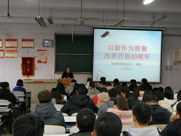 为纪念改革开放40周年,深入开展“不忘初心,牢记使命”主题教育,加强大学生思想政治教育,提升大学生认识和把握时事政策的能力,12月12日下午,临床医学系党总支在2017级普临1班教室举办了形势与政策讲座,党总支书记蒲爽为200余名学生干部做了题为《以新作为致敬改革开放40周年》的辅导讲座。