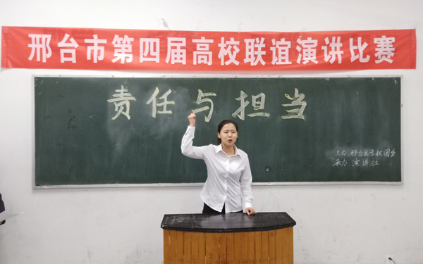 今年高校联谊演由我校主办,演讲社承办。来自邢台学院、邢台职业技术学院、河北机电职业技术学院和邢台医专的12名选手汇聚一堂,以“责任与担当”为主题,展开了热情饱满、慷慨激昂的演讲。