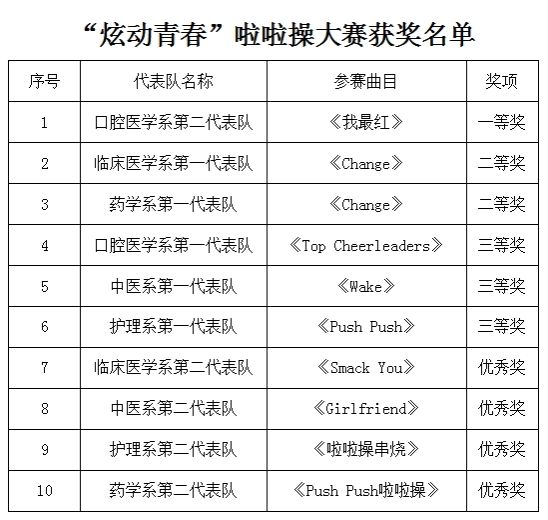 比赛中,10支代表队的队员们洋溢着青春灿烂的微笑,舞动着色彩斑斓的花球,踏着欢快而富有激情的舞步,动作整齐、配合默契,以动感的节奏、优美的舞姿嗨翻全场,台下掌声欢呼声此起彼伏。经过激烈角逐,评选出一等奖1个、二等奖2个、三等奖3个、优秀奖4个,其中口腔医学系第二代表队凭借出色的表现荣获此次大赛一等奖。