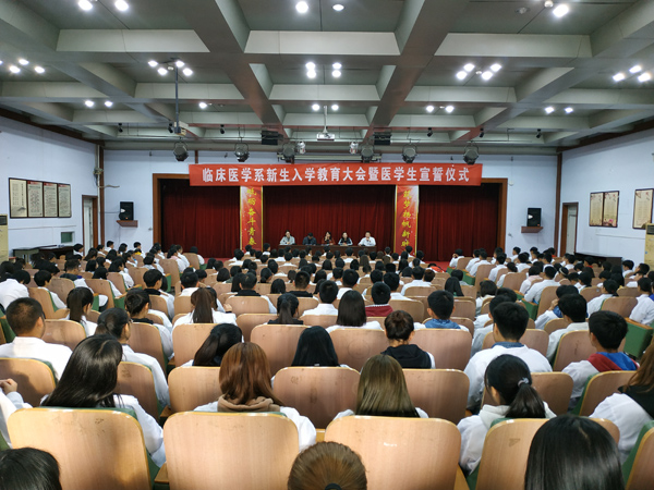 为引导2018级新生更好的融入大学生活,树立新的奋斗目标,10月25日,临床医学系在学术报告厅举行新生入学教育大会暨医学生宣誓仪式。系党总支书记蒲爽、副书记张晶娜,副主任刘庆文、白志峰,2018级全体辅导员及280名新生代表参加了大会。
