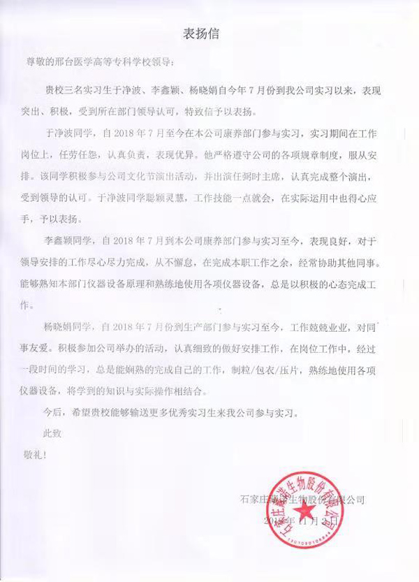 近日,石家庄臧诺生物股份有限公司给我校发来表扬信。今年7月,我校药学系药学专业2016级学生于净波、李鑫颖、杨晓娟到石家庄臧诺生物股份有限公司实习。实习期间三名学生表现优异,实践和创新能力突出,在各自的岗位勤学好问、尽职尽责,充分发扬了吃苦耐劳、严于律己的工作作风,出色的完成了各项工作任务,优秀的工作表现受到用人单位的高度肯定。信中还对校企双方今后的合作前景充满信心。