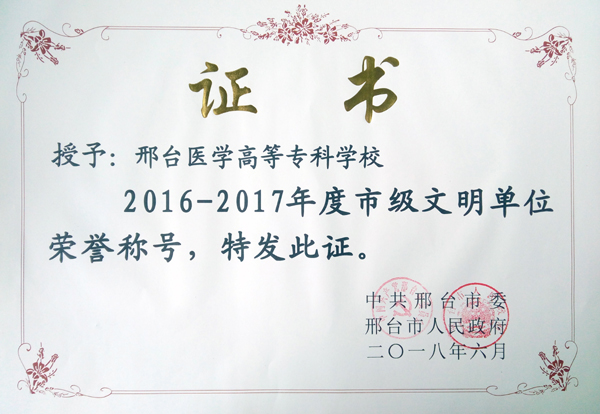 近日,我校被中共邢台市委、邢台市人民政府授予“2016-2017年度市级文明单位”荣誉称号,邢台医专爱心超市志愿服务项目被邢台市文明办授予“2017年度邢台市志愿服务创新项目”荣誉称号。