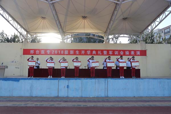 在《邢台医专校歌》声中,开学典礼落下帷幕,各新生班进行了军训会操表演。2018级新生在教官的指挥下,迈着坚毅的步伐,喊着嘹亮的口号,军容严整、意气风发、英姿飒爽,以最高昂的士气、最威武的军姿、最整齐的队列,依次走过主席台,展现出朝气蓬勃、奋发向上的青春风采和精神风貌,赢得了在场师生们的赞誉。