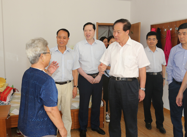调研组一行首先来到学校第三附属医院,听取了工作人员关于学校一校三院一中心的简要介绍,在学校领导田德荣、杜成旭陪同下参观了康复诊疗中心的运动治疗室、药浴熏蒸室、儿童康复室。随后来到凰寺老年养护中心,在住养老人秦淑云的房间,王培安副主任一行和老人亲切攀谈,详细了解老人的家庭成员、收入来源、住养感受,并对养护中心优美的环境和人性化管理给予了肯定。