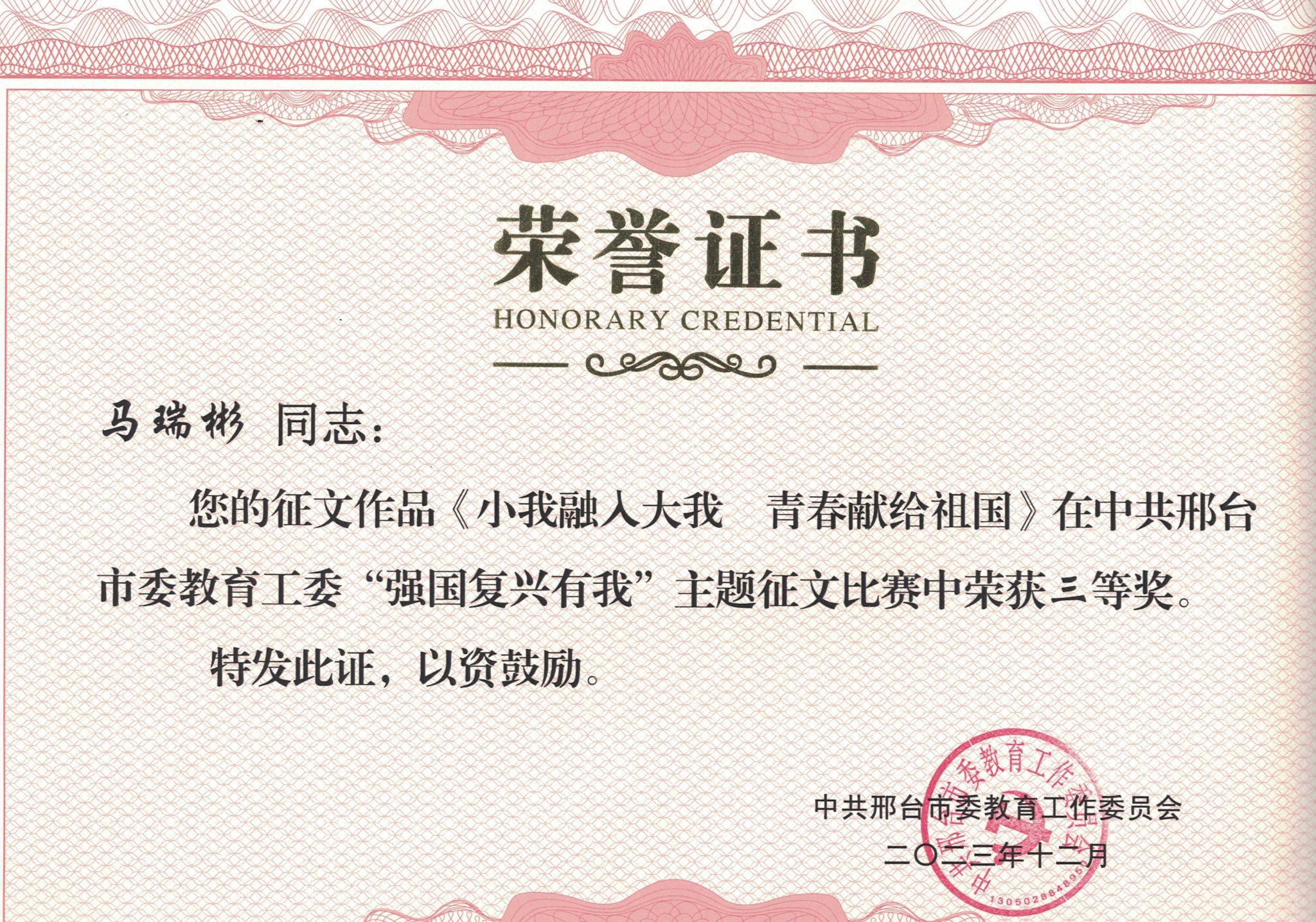 近日,中共市委教育工委“强国复兴有我”主题征文比赛评选结果揭晓,我校临床医学系教师张云鹏荣获二等奖,马克思主义学院教师马瑞彬荣获三等奖。
