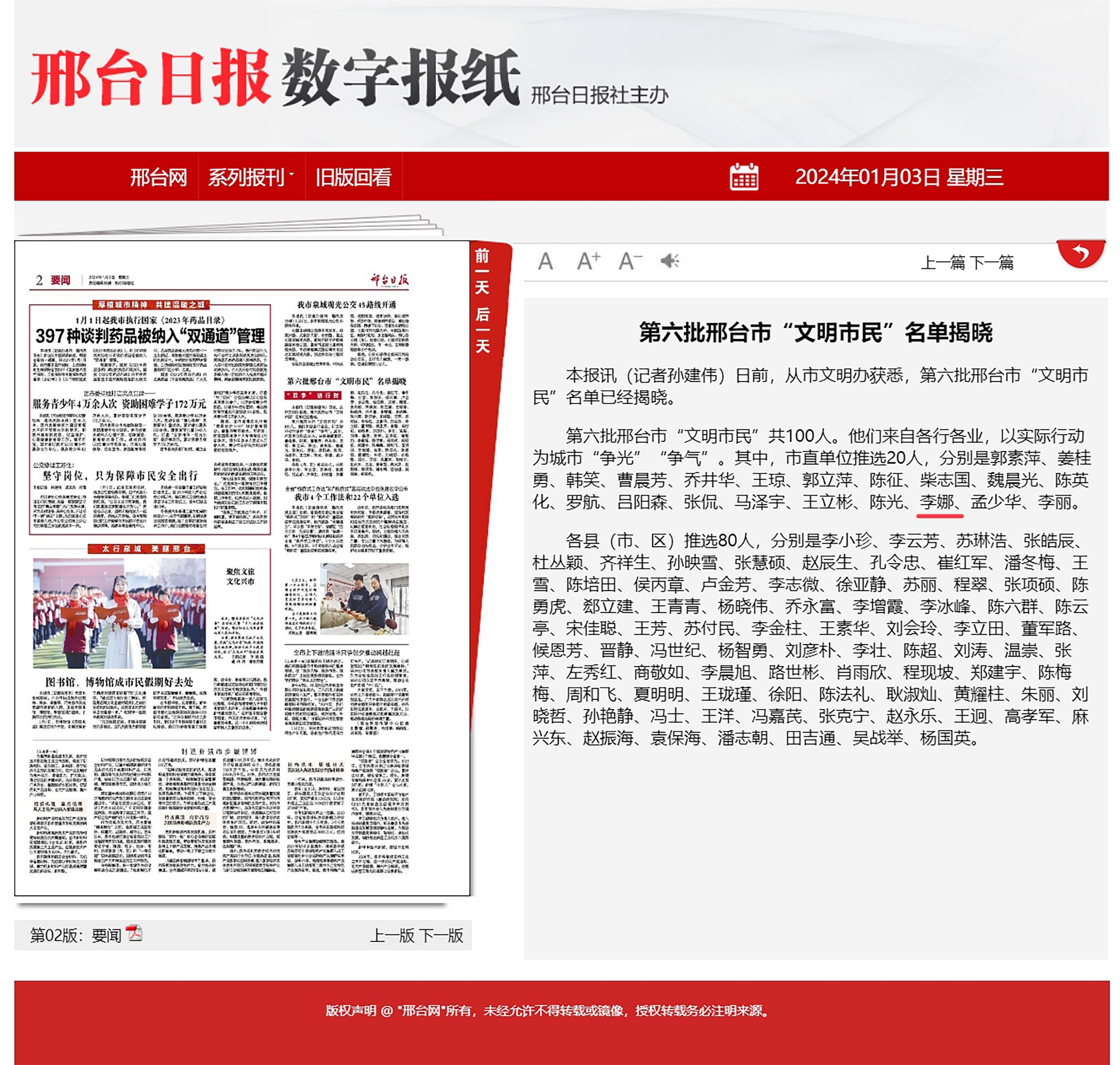 近日,邢台市第六批“文明市民”名单揭晓,我校基础医学部第一党支部书记、微免教研室主任李娜获评。