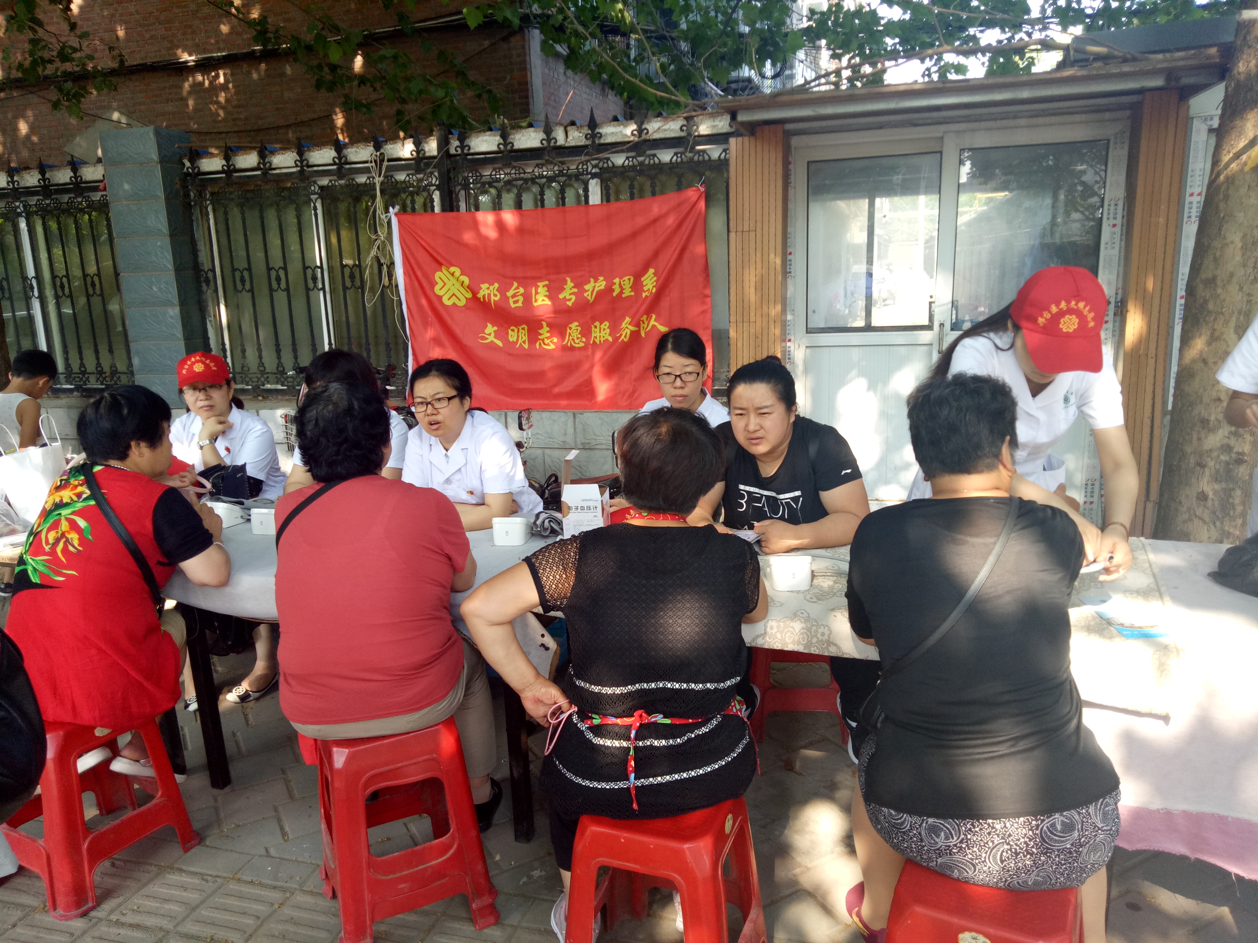 在创城活动中,学校除了完成环境清洁、知识宣传、文明劝导、问卷调查等工作外还结合医学院校自身特色抽调优秀骨干教师组建健康服务队,有针对性的开展志愿服务活动。例如邮局家属院老年人居多,护理系党总支便组织开展了“庆七一 助创城”进社区健康咨询、义诊服务活动,让老人在家门口就能享受到专业、热情的医疗服务。考虑到老年人起床较早,测血糖需要空腹等情况,一些家远的志愿者不到七点就出门了,早晨七点半所有志愿者自带听诊器、血压计、血糖仪在义诊场地准备就绪。在活动中,志愿者们对前来就诊居民详细询问病史、认真查体、综合分析临床资料,耐心解疑答惑,制定科学的治疗方案,提出各种疾病的预防措施,得到了社区居民的好评与赞誉,一些年龄大的居民多次表示,义诊活动让他们感受到政府的关心,希望今后多举办这样的活动。